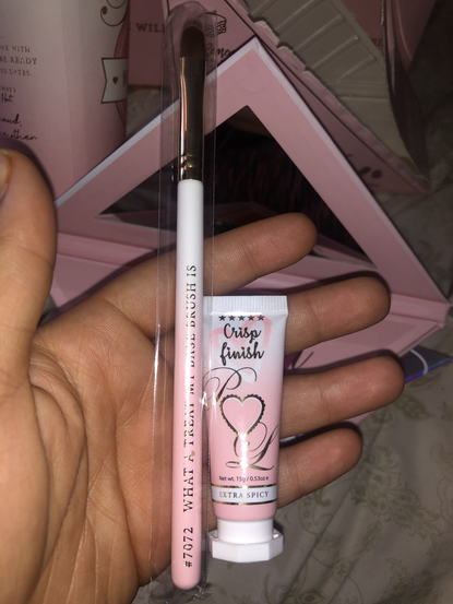 My purchase arrived within a P.Louise shopping bag which was by far the cutest thing ever! The "Dishin' the dirt" collection included your choice of one her "Crisp finish" latest primers, "Browtiful-Mochaccino" eyebrow kit and a "Sandwich stages" eyeshadow set. I then added another "Crisp finish cosmetic paint" in shade "Smokin' hot," two Acid Reign primers in shade "blank canvas" and the P.louise "Badda black" primer.